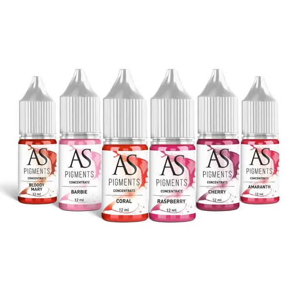 Le Set de 6 pigments concentrés 12 ml d'AS Pigments est conçu pour le maquillage permanent des lèvres, offrant une gamme de teintes intenses et durables.