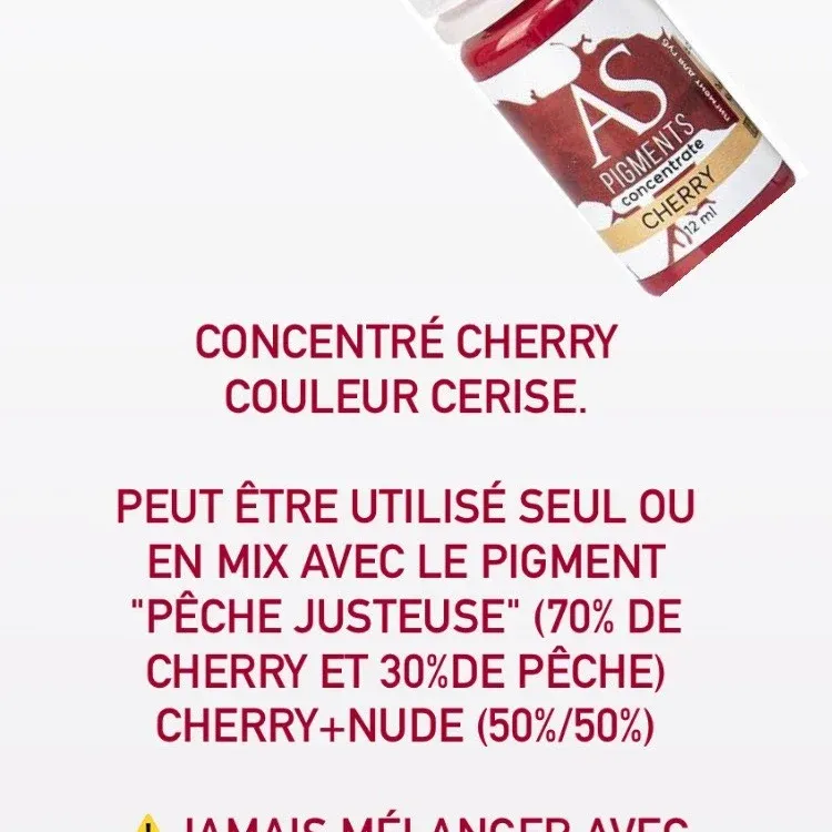AS Cherry : Couleur cerise concentrée, froide, pouvant être mélangée avec d'autres pigments AS lèvres, sauf Plum Dessert.